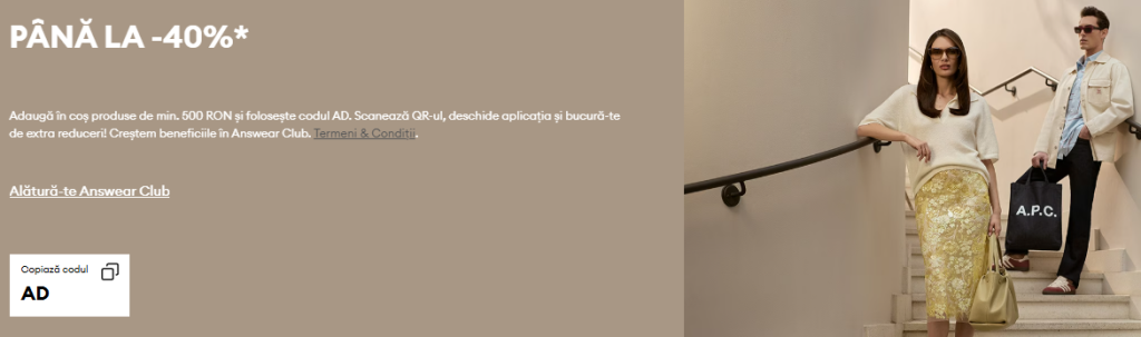 Da, Answear ofera adesea un cod de 15% reducere pentru clientii noi care se aboneaza la newsletter, valabil doar pentru prima comanda.