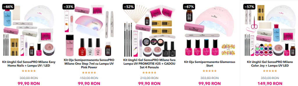 Pe langa gama Luxorise si SensoPRO Milano, gasesti si seturi complete, ideale pentru incepatori sau pentru profesionisti care vor sa economiseasca. De exemplu, ai kituri cu gel si lampa, pachete cu reduceri consistente si chiar produse cadou incluse in promotii limitate. Tot aici gasesti si produse pentru epilare, machiaj si alte accesorii beauty.